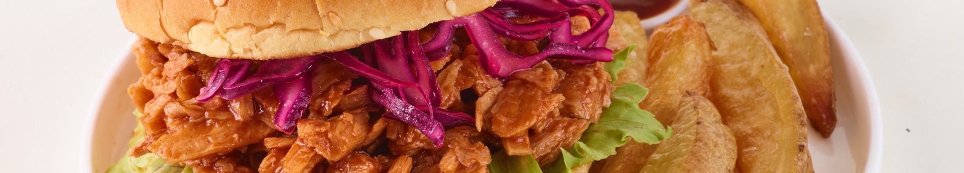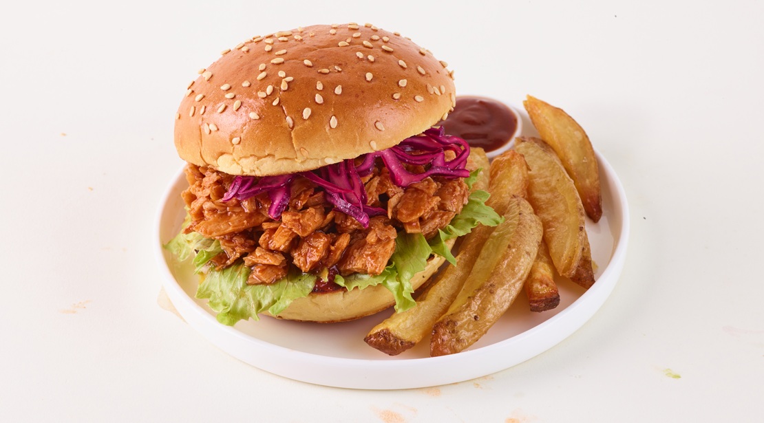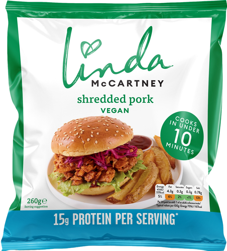 Vegan shredded pork-style pieces made with rehydrated textured soya and wheat protein.